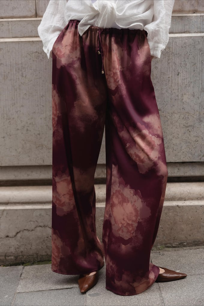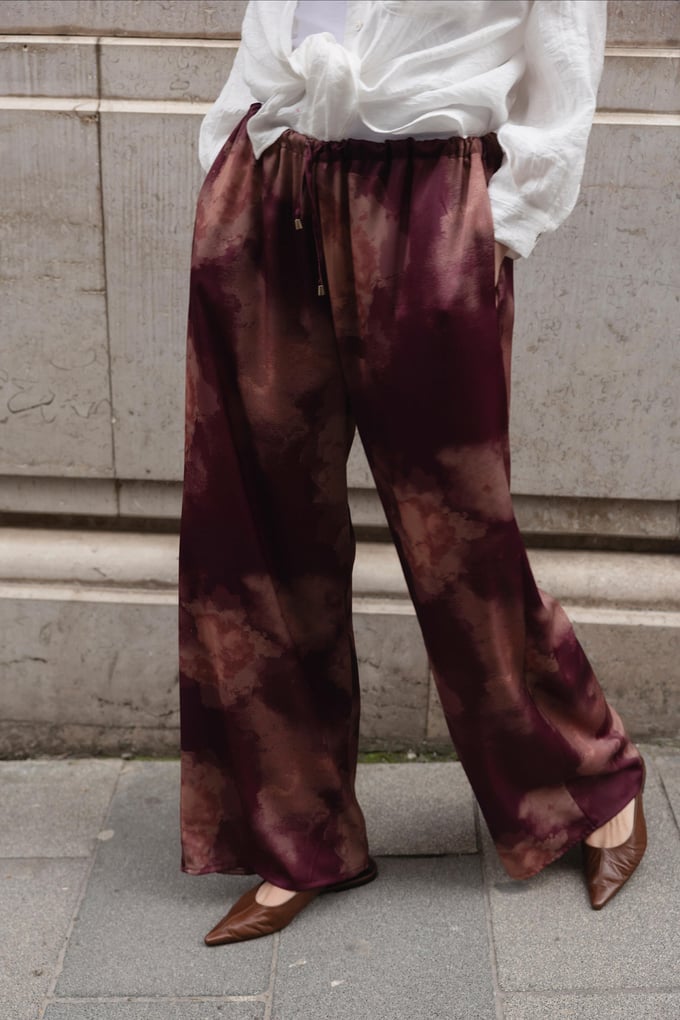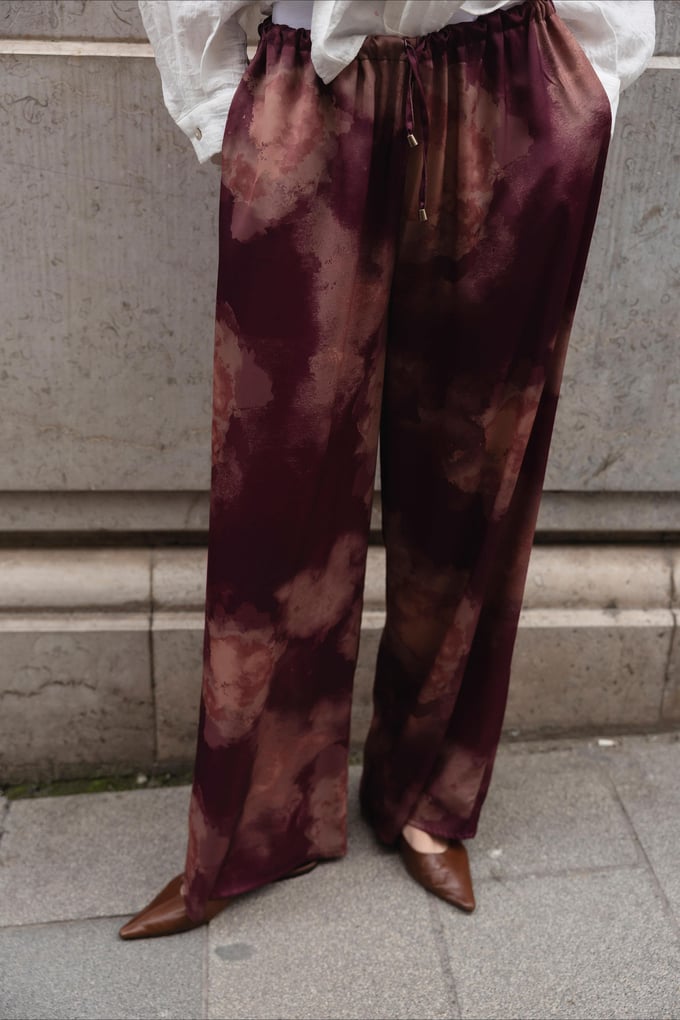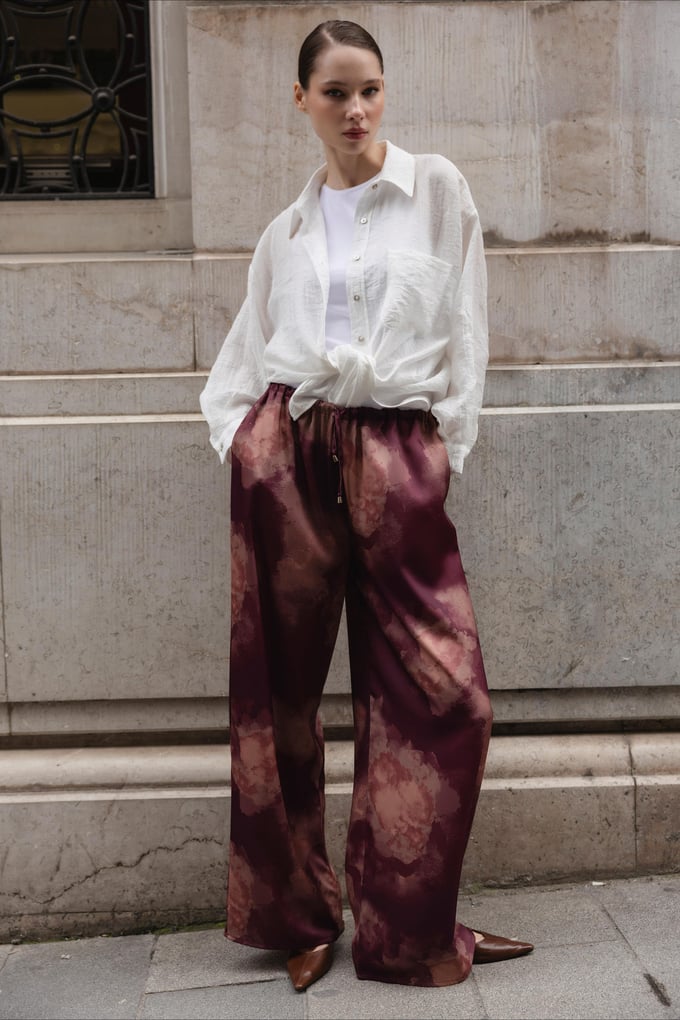 • Model: Beli lastikli, bol paça, desenli saten pantolon