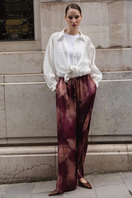 Konforu ve şıklığı bir arada sunan beli lastikli desenli saten pantolon, dökümlü yapısı ve parlak dokusuyla hem günlük hem de şık kombinlerde tercih edilebilir. Bol paça kesimi özgür hareket imkânı sağlarken, lastikli bel detayı rahat bir kullanım sunar.